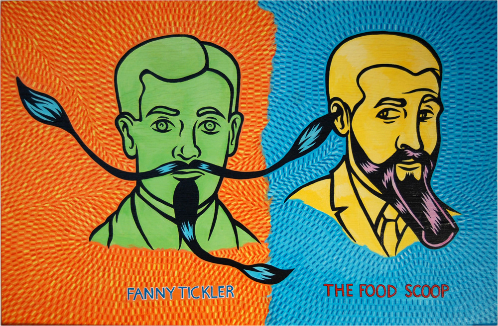 A series of paintings for a solo art exhibit featuring weird beards. All the work is acrylic paint on wood. The masks are papier-mâché with acrylic.